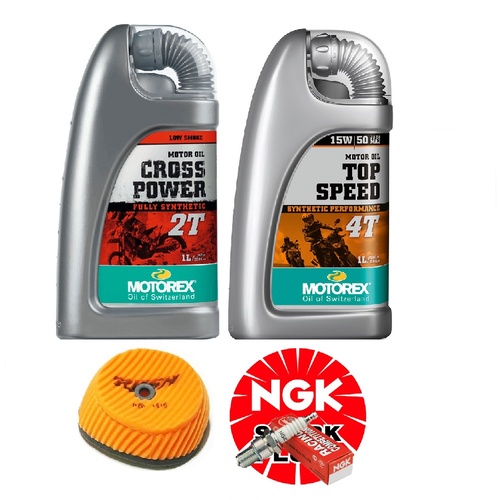 KTM 65SX (01-19) Motorex Oil-NGK plug O2Rush Air Filter Engine Service Kit
